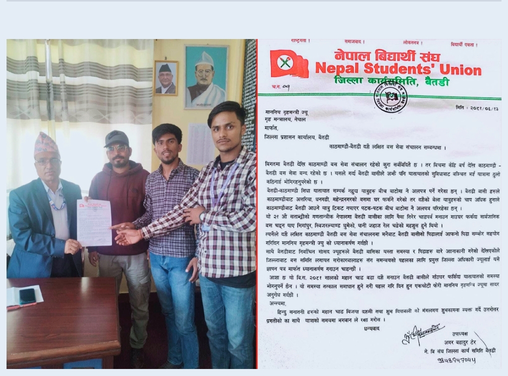 दशैंतिहारलाई लक्षित गरेर बस सेवा सञ्चालन गर्नुपर्ने माग गर्दै जिल्ला प्रशासन कार्यालयमार्फत गृहमन्त्रीलाई ध्यानाकर्षण गराइएको छ।