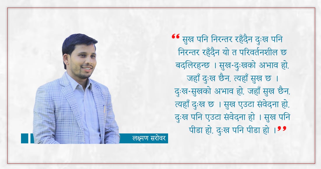 सुख भनेको धन, सम्पत्ति, पैसा, सत्ता, परिवार वा सुविधा सम्पन्न व्यक्तित्व हो । यदि हो भने गौतम बुद्धले किन यी सब कुराहरुलाई त्यागी शान्तिको खोजीमा जंगलतिर लागे ?”