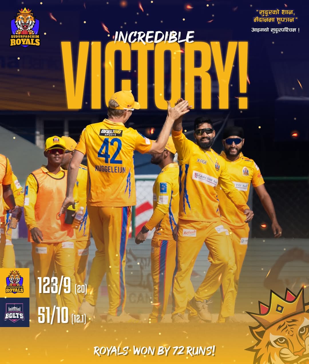 सुदूरपश्चिमका बलरले घातक बलिङ सामु जनकपुरका ब्याटर निरीह हुँदा १२४ रनको लक्ष्य पछ्याएको जनकपुर १२.१ ओभरमा ५१ अलआउट भयो ।