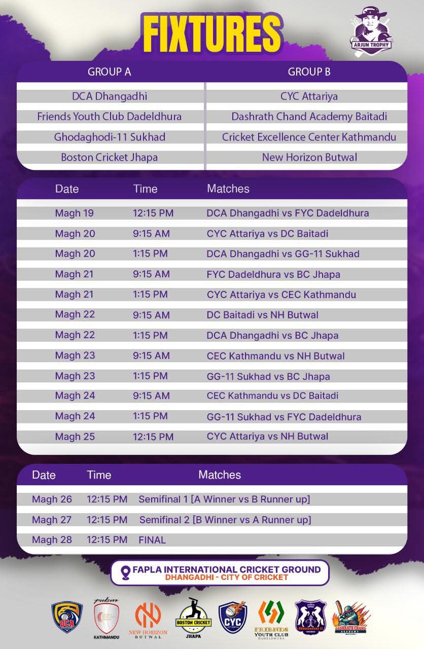 माघ १९ गते हुने उद्घाटन खेलमा डिसिए धनगढी र फेन्ड्स युवा क्लब डडेल्धुरा प्रतिस्पर्धा गर्ने भएका छन् । माघ २० गते सिवाईसी अत्तरिया र दशरथ चन्द एकेडेमी बैतडीले पहिलो खेल खेल्दा दोस्रो खेलमा डिसिए धनगढी र घोडाघोडी–११ सुख्खड कैलाली खेल्नेछन् । माघ २१ गते पहिलो खेलमा फेन्ड्स युवा क्लब डडेल्धुरा र बोष्टन क्रिकेट झापा तथा दोस्रो खेलमा सिवाईसी अत्तरिया र क्रिकेट एक्सिलेन्स सेन्टर काठमाण्डौं खेल्नेछन् ।