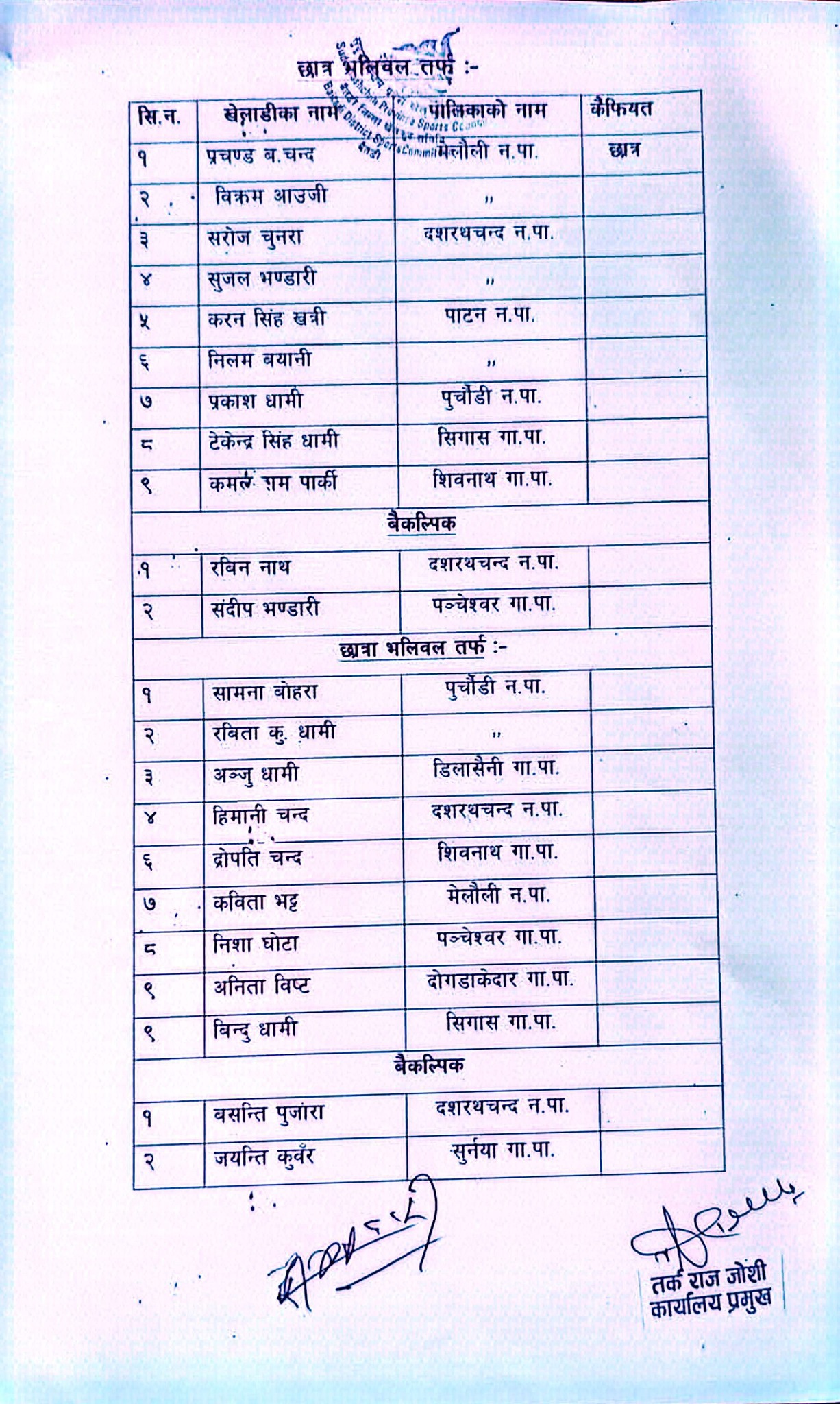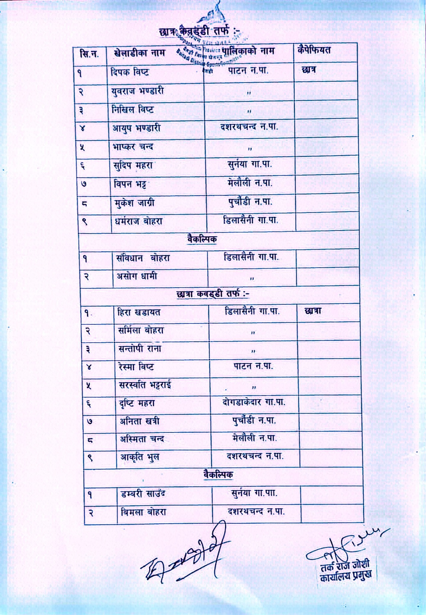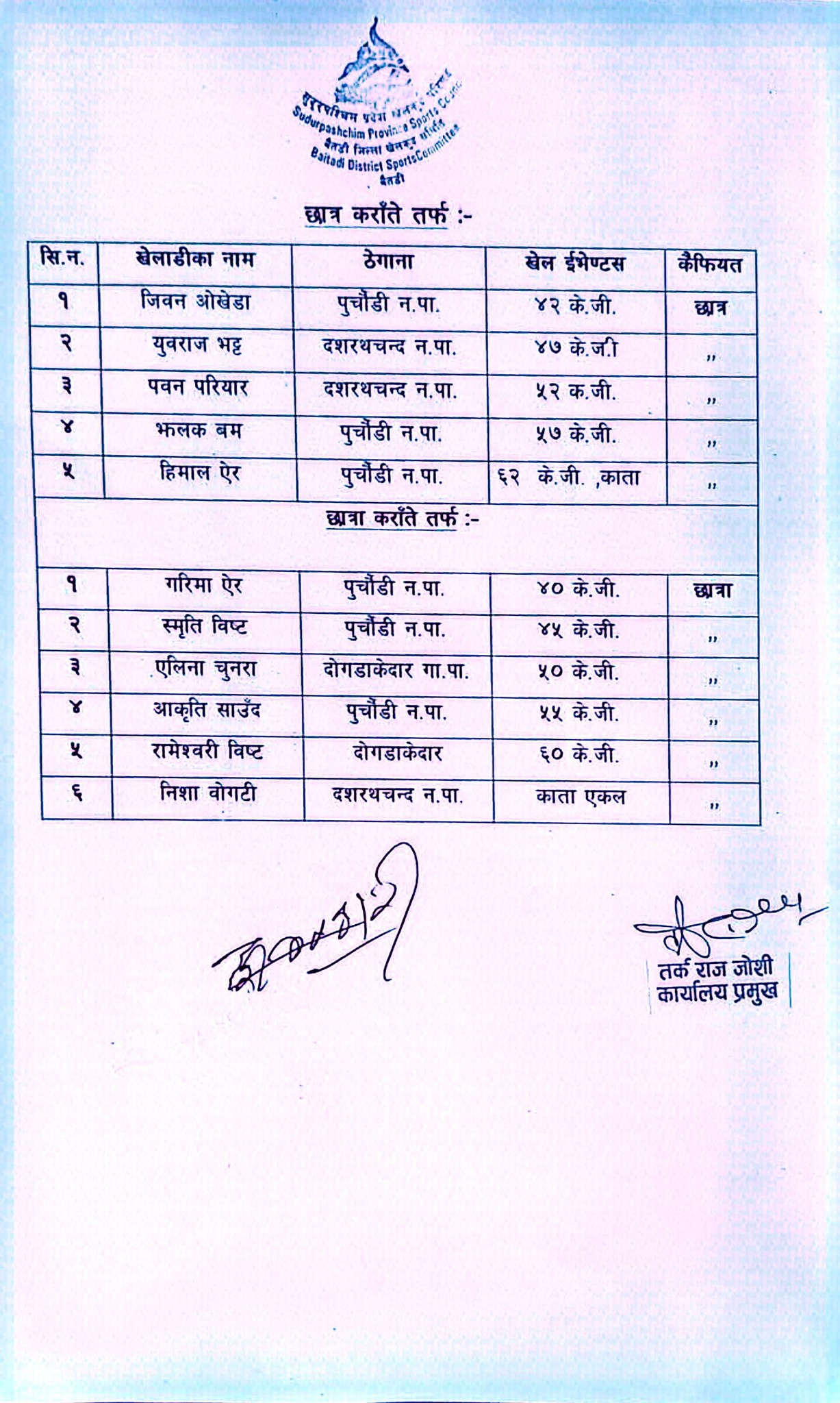 बैतडी जिल्ला खेलकुद समितिका कार्यालय प्रमुख तर्कराज जोशीका अनुसार जिल्लास्तरीय प्रतियोगितामा उत्कृष्ट प्रदर्शन गरेका आधारमा खेलाडी छनौट गरिएका हुन् ।