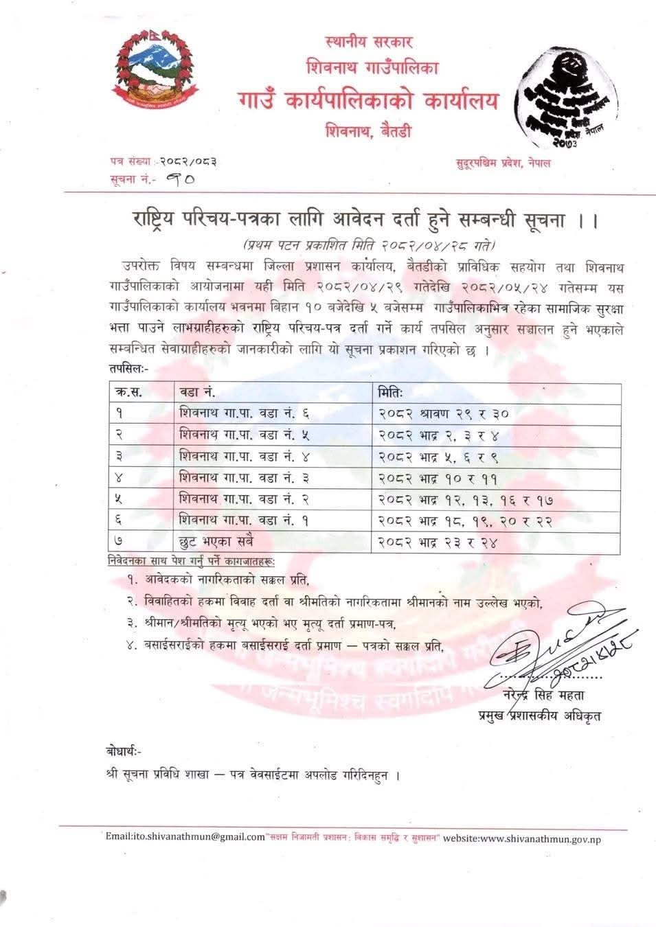 बैतडी: जिल्लाको शिवनाथ गाउँपालिकामा भोलि (बिहीबार) देखि राष्ट्रिय परिचयपत्रकाे विवरण संकलनका लागि दर्ता शिविर सञ्चालन हुने भएकाे छ।