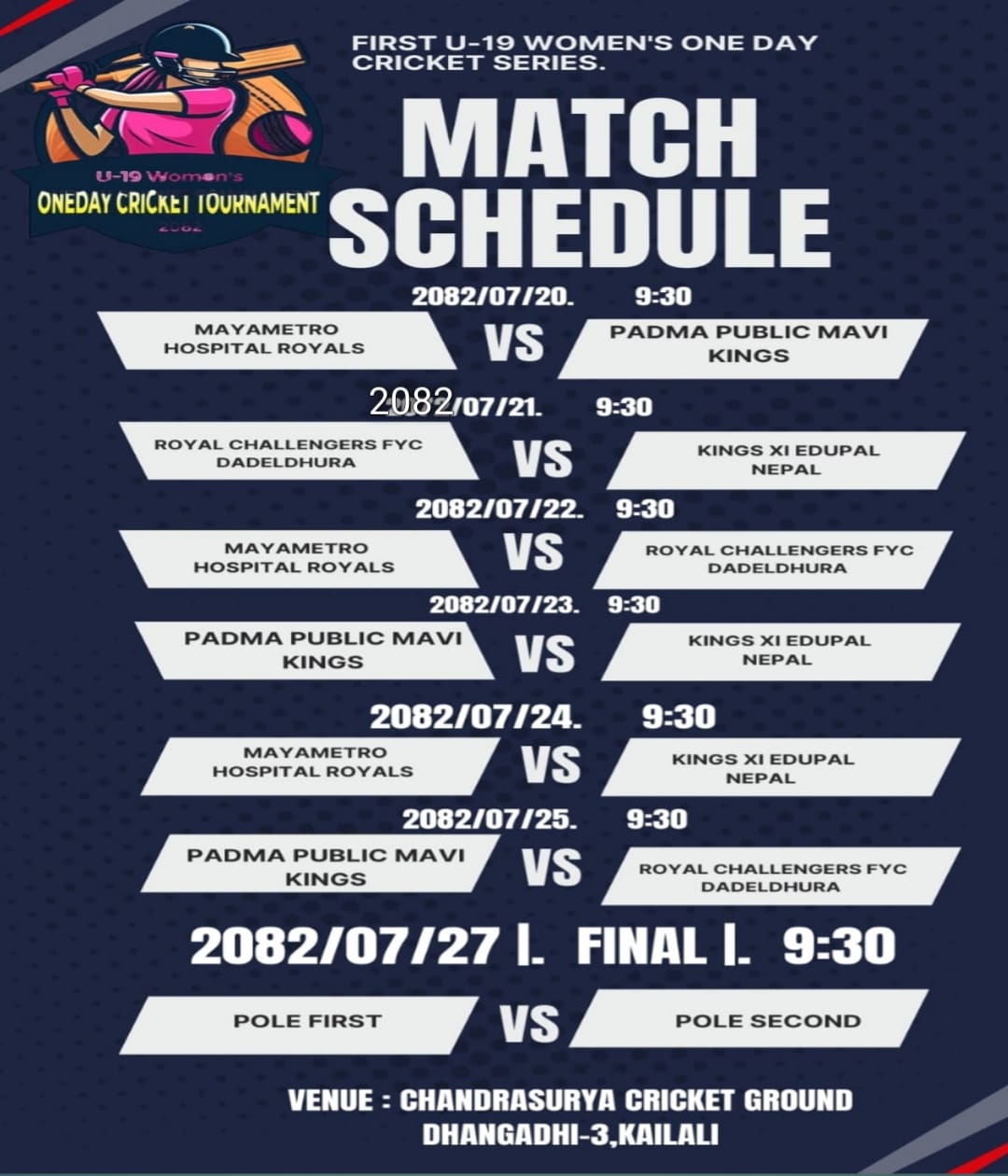 कात्तिक २१ गते एफवाइसी डडेल्धुरा र इडुपल नेपाल, कात्तिक २२ गते मायामेट्रो र एफवाइसी डडेल्धुरा, कात्तिक २३ गते पद्मा पब्लिक र इडुपल नेपाल, कात्तिक २४ गते मायामेट्रो र इडुपल नेपाल तथा कात्तिक २५ गते पद्मा पब्लिक र एफवाइसी डडेल्धुरा खेल्नेछन् ।