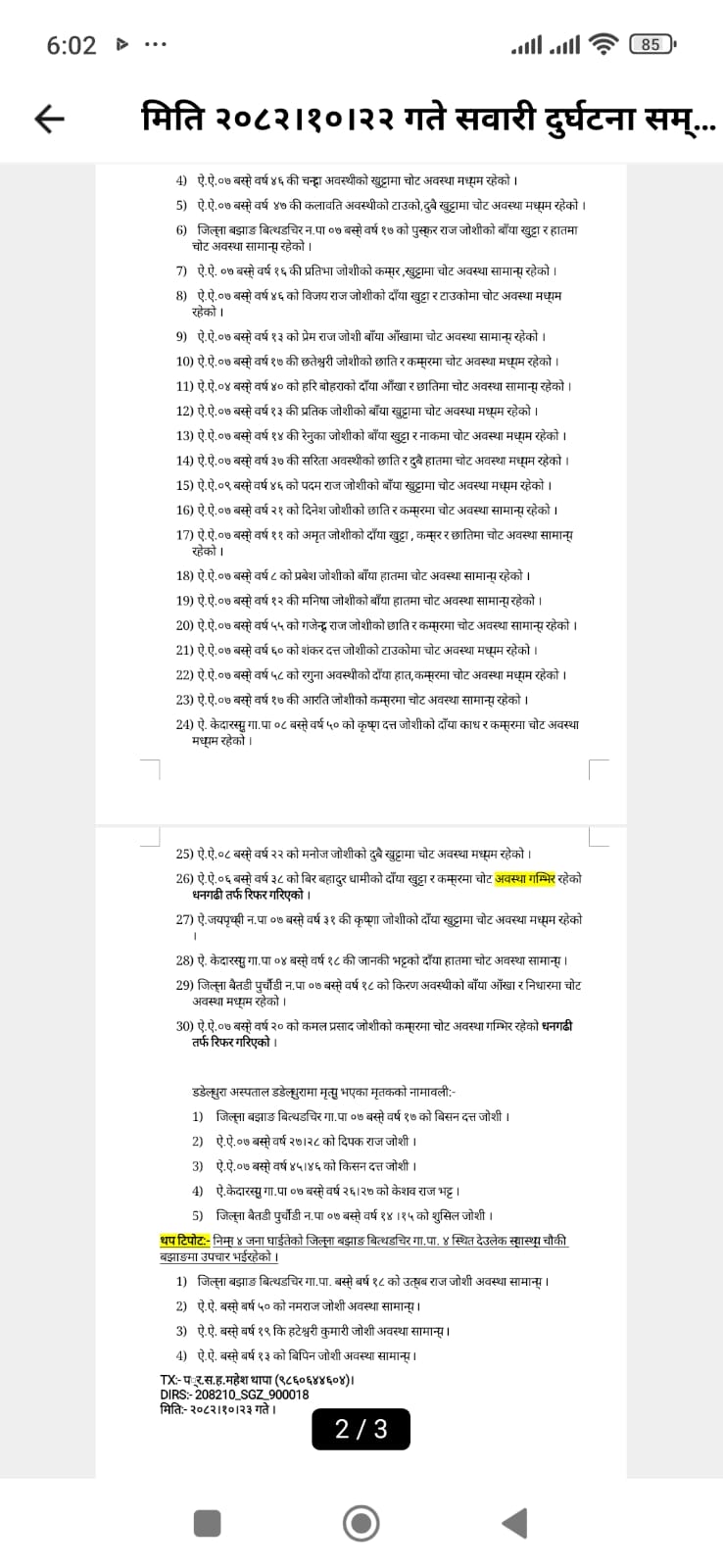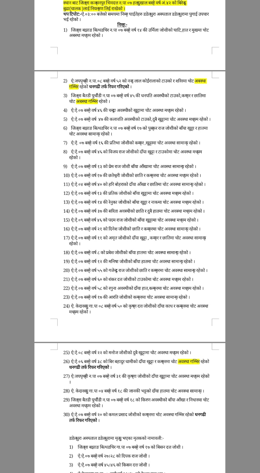 घटनास्थलमै मृत्यु हुनेमा बझाङकाे बित्थडचिर गाउँपालिका-७ का ४० वर्षीय केशबराज जाेशी,साेही ठाउँका १३ वर्षीय अशाेकराज जाेशी,३५ वर्षीय वसन्त जाेशी,४१ वर्षीय विसनदत्त जाेशी, ४२ वर्षीय नरेशराज जाेशी, बझाङ केदारस्यू गाउँपालिकाका ६० वर्षीय माेहनदेव भट्ट,जयपृथ्वी नगरपालिका बझाङका ४० वर्षीय बशन्तराज रतला, बैतडी पुर्चाैडी-७ कि ४० वर्षीया पुस्पा अवस्थी रहेकी छन्।