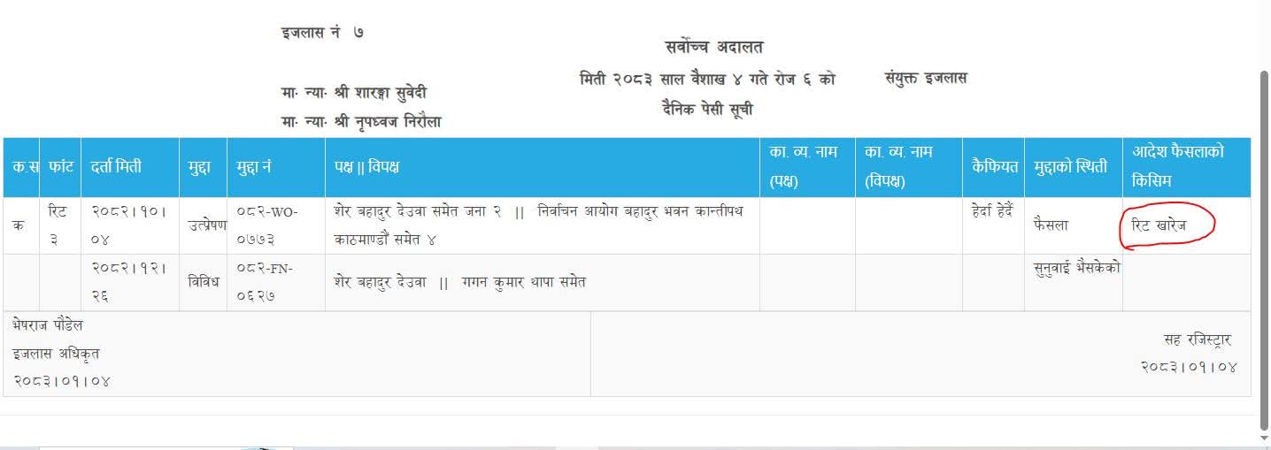 त्यसविरुद्ध तत्कालीन सभापति शेरबहादुर देउवा पक्षको निवेदनमा निर्वाचन आयोगले थापा पक्षलाई नै आधिकारिकता दिएपछि देउवा पक्ष ४ माघ २०८२ मा सर्वोच्च अदालत गएको थियो।